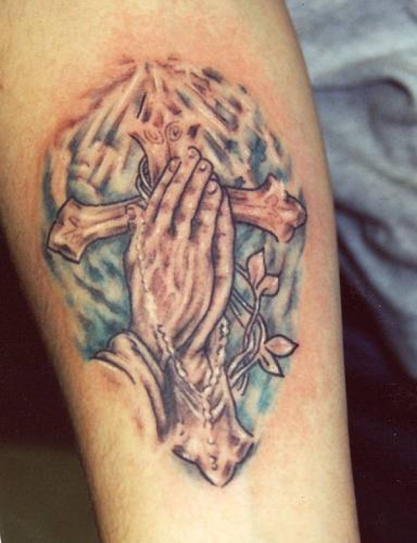 祈祷之手和十字架纹身图案
