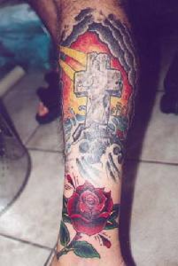 十字架墓碑和红玫瑰纹身图案