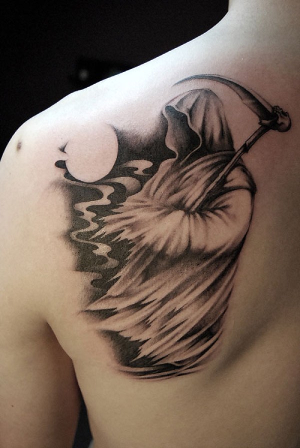 超帅时尚的黑灰骷髅与蛇纹身图案