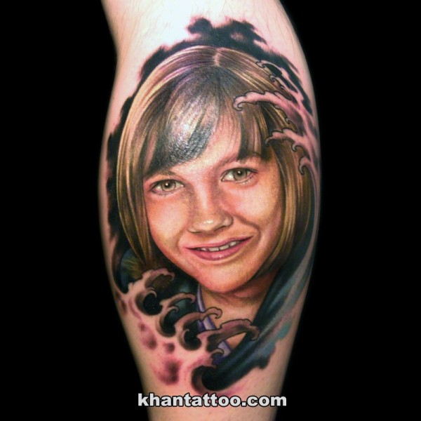 小腿彩色女人肖像纹身图案
