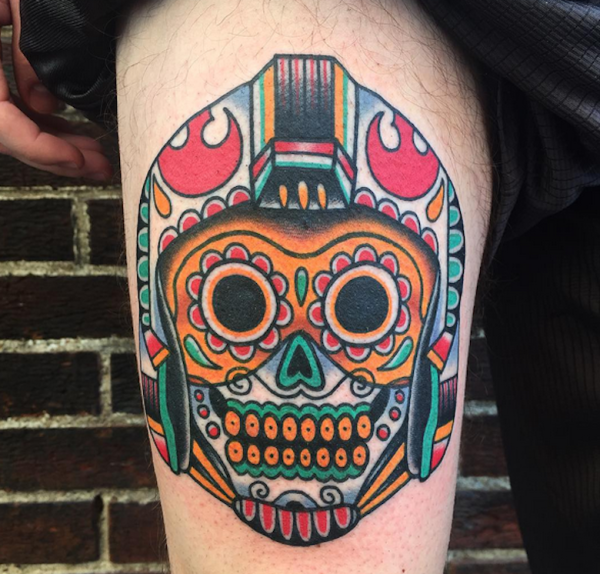 大腿墨西哥传统风格彩色骷髅与头盔纹身图案