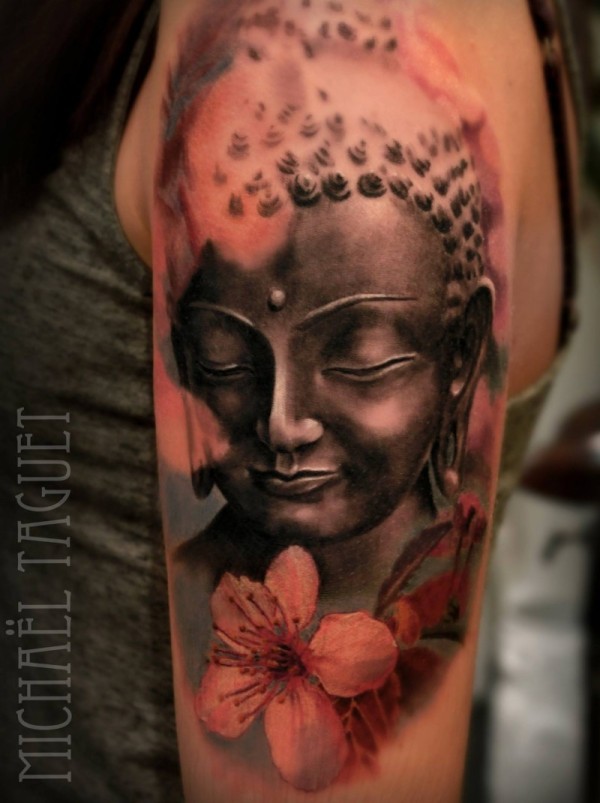 手臂彩色花卉如来佛祖雕像纹身图案