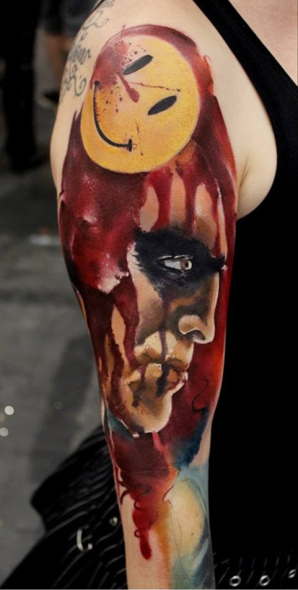 手臂插画风格血腥人像和黄色笑脸纹身图案