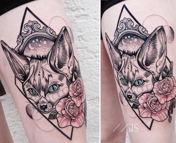 大腿new school彩色狐狸与玫瑰几何纹身图案