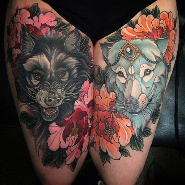 大腿彩色邪恶狼与可爱狼花朵纹身图案