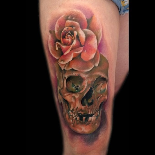 大腿写实彩色骷髅和玫瑰纹身图案