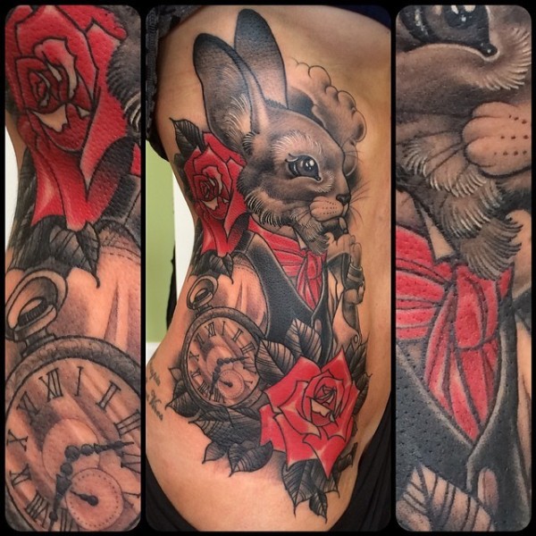 侧肋school兔子结合红玫瑰和时钟纹身图案