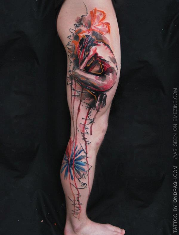 腿部水彩风格彩色抽象女人与花朵纹身图案