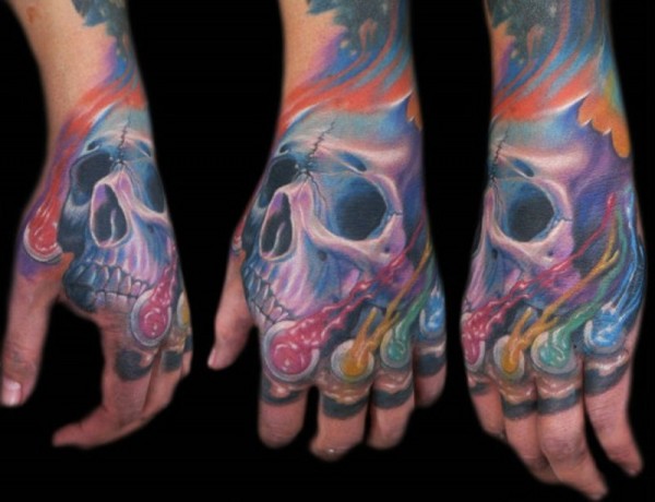 手背彩色未来主义骷髅和水母纹身图案