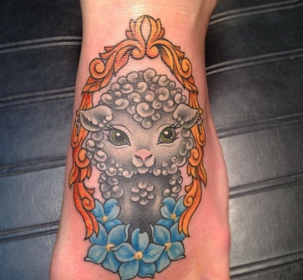 脚背可爱的灰羊和镜子框架花朵纹身图案