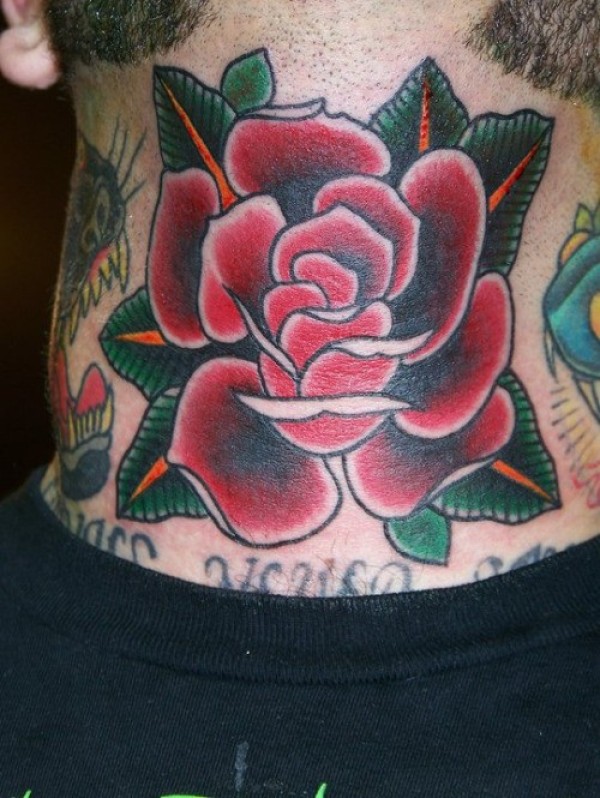 颈部school红玫瑰与绿叶纹身图案