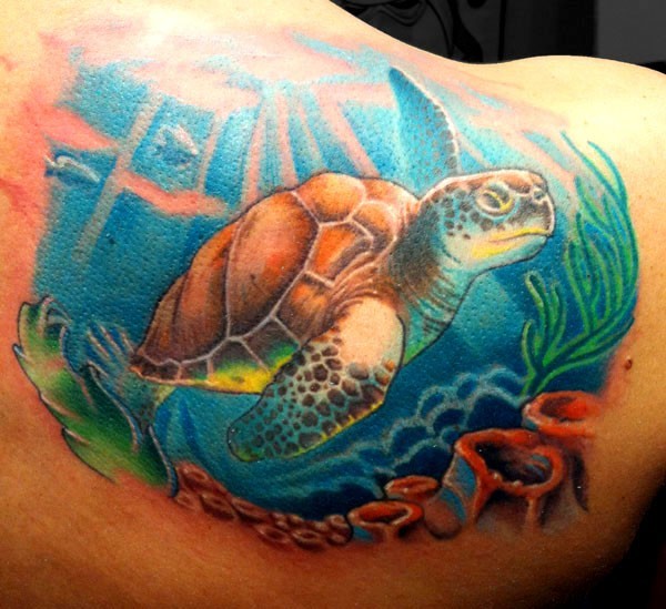可爱的彩色乌龟和海底纹身图案