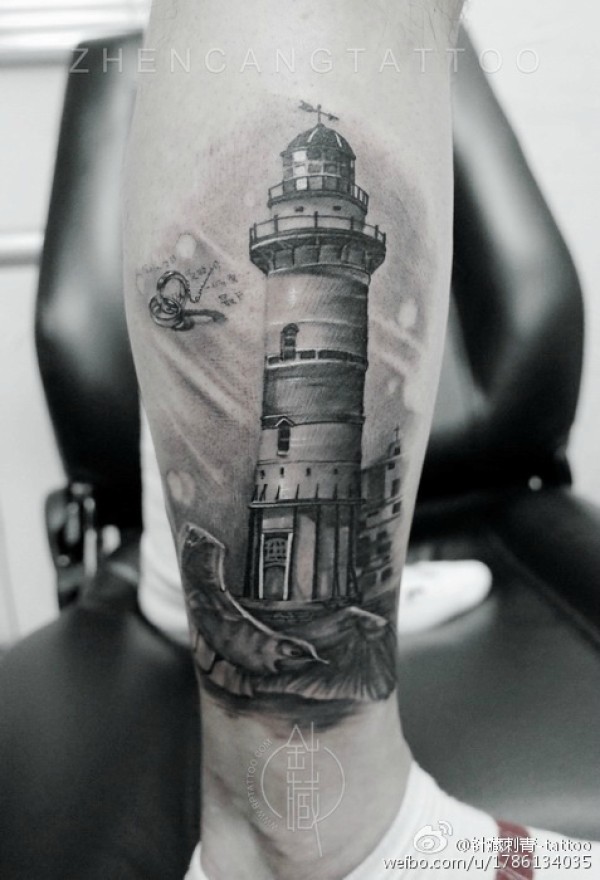 包小腿写实灯塔纹身图案
