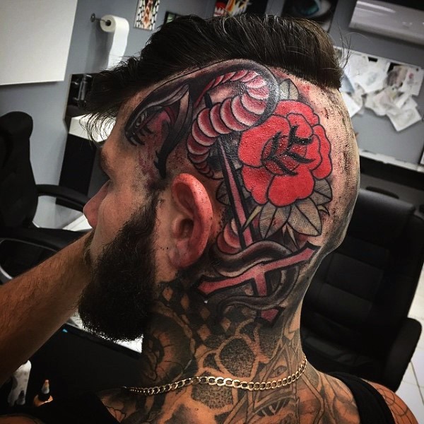 头部old school彩色玫瑰花与蛇和匕首纹身图案