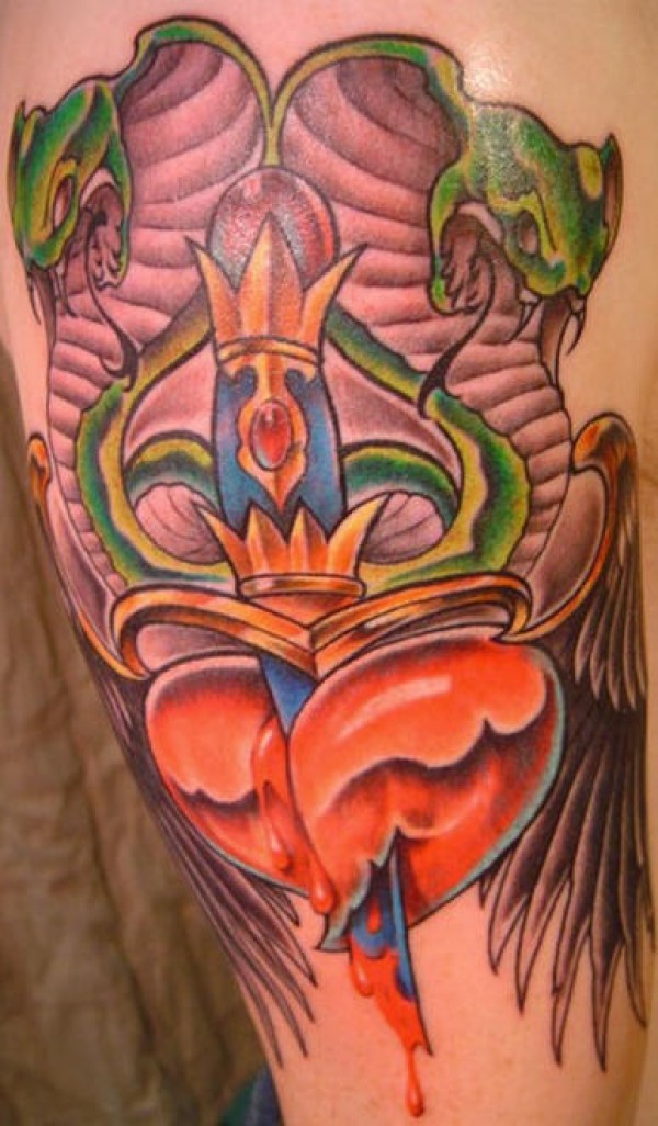 匕首刺破心和眼镜蛇纹身图案