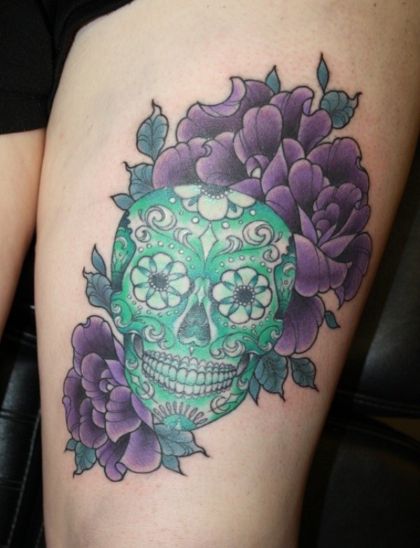 大腿可爱的翡翠骷髅和花蕊纹身图案