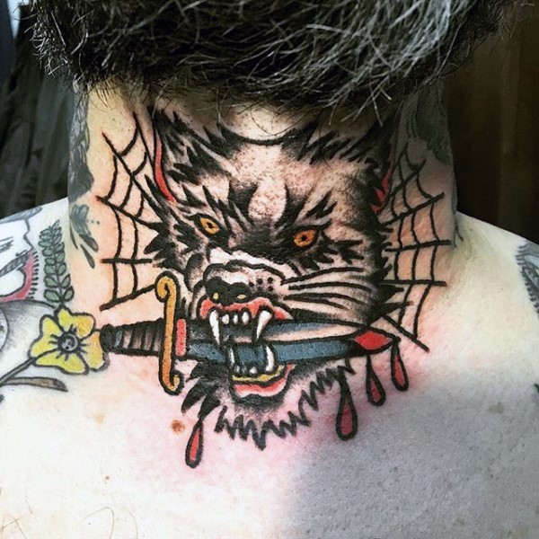 颈部old school疯狼血淋淋的匕首蜘蛛网纹身图案