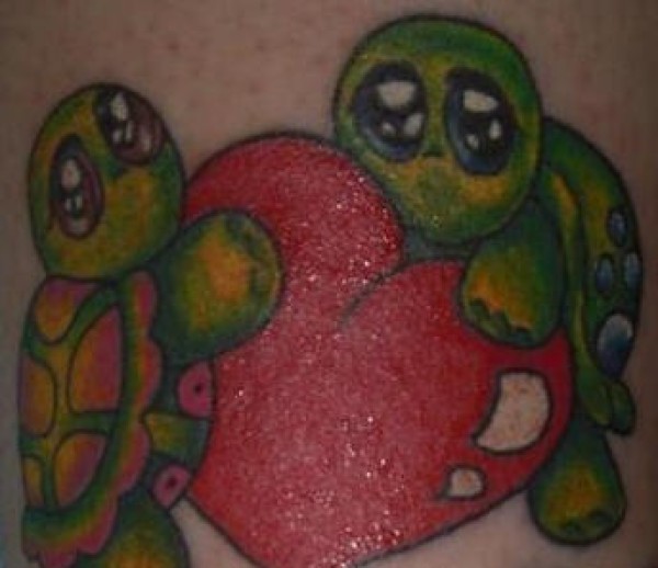 两只绿色乌龟和红心可爱纹身图案