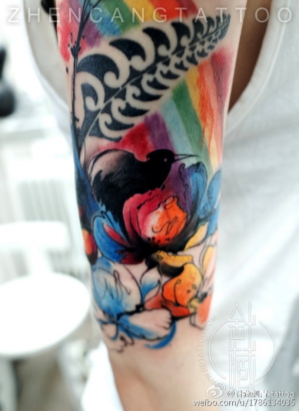 在原有的图腾和彩虹纹身基础上加入了水彩花鸟