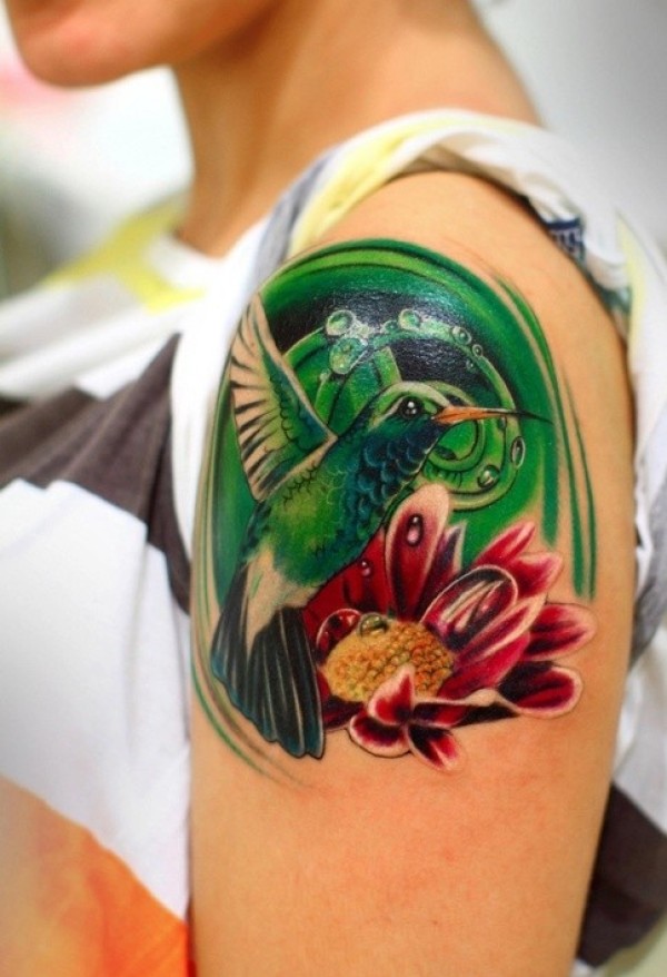 肩部可爱多彩的蜂鸟花卉纹身图案