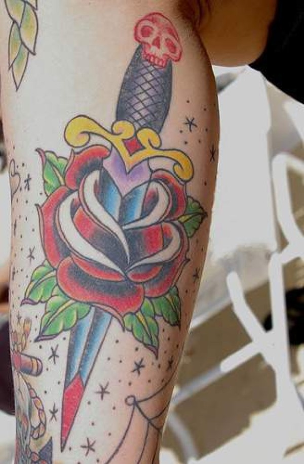 匕首刺入玫瑰彩色纹身图案