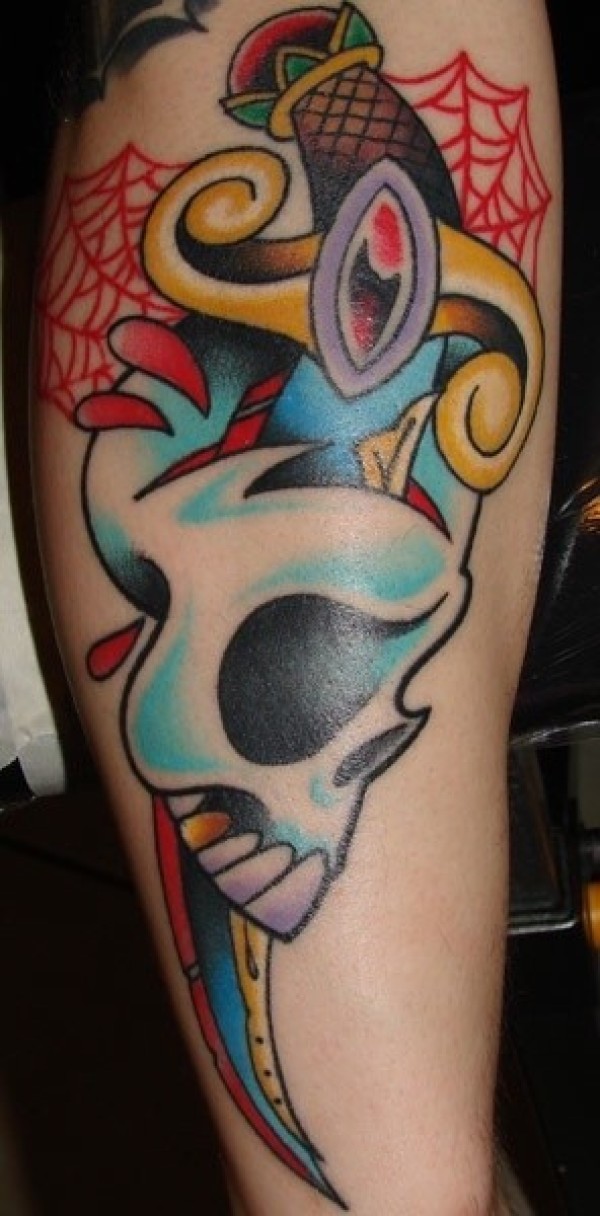 匕首刺穿骷髅和红蜘蛛网纹身图案