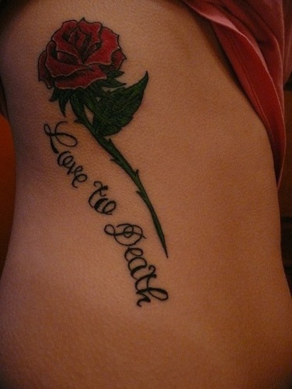 侧肋红色玫和死亡英文字母纹身图案