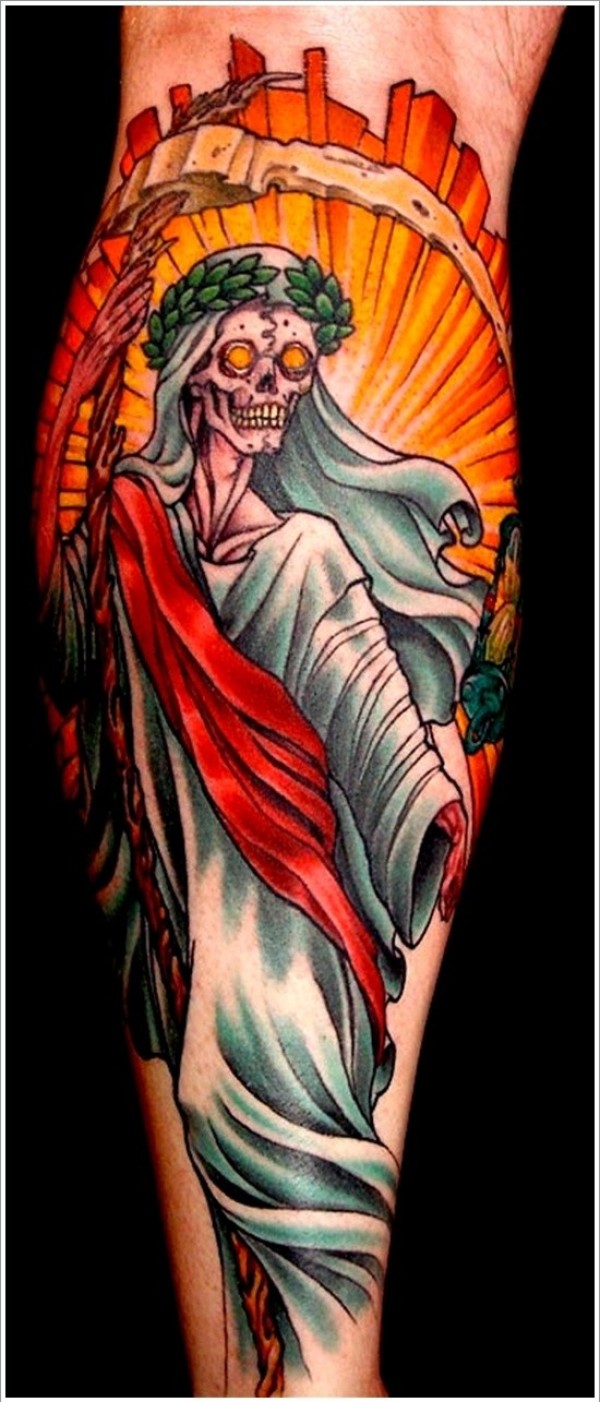裹尸布中的死神和月桂花环纹身图案