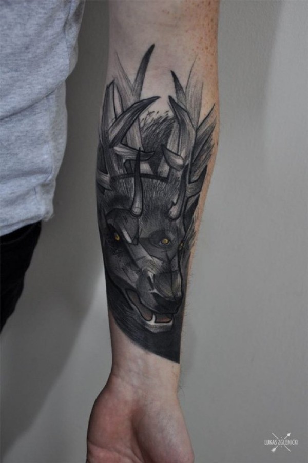 小臂雕刻风格彩色恶魔鹿纹身图案