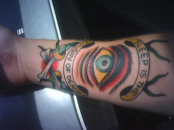 school彩色眼睛骨头和英文字母纹身图案