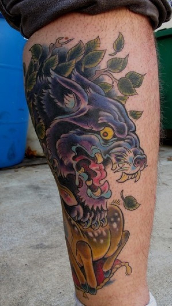 小腿new school彩色邪恶的狗与树叶和鹿纹身图案