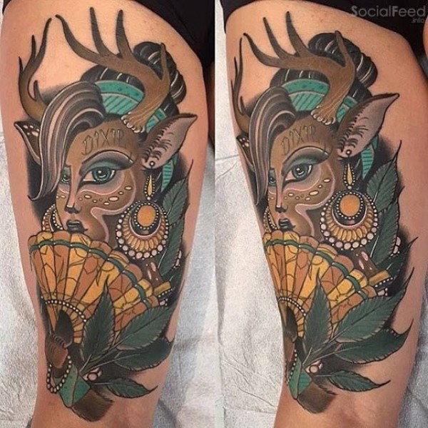 大腿new school彩色女人面相鹿角扇子纹身图案