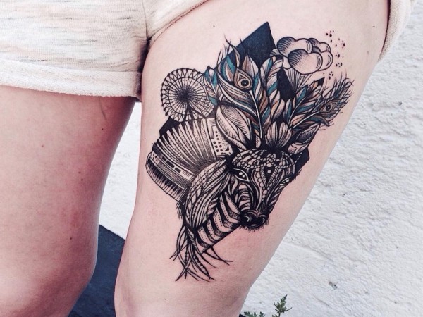 大腿new school彩色羽毛和幻想鹿纹身图案