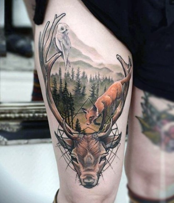 大腿自然世界生活的露狐狸猫头鹰纹身图案