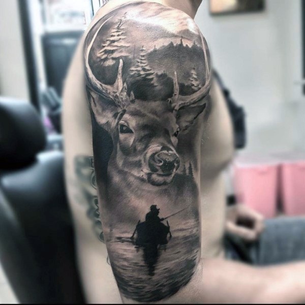 大臂写实逼真的鹿在森林与渔民纹身图案