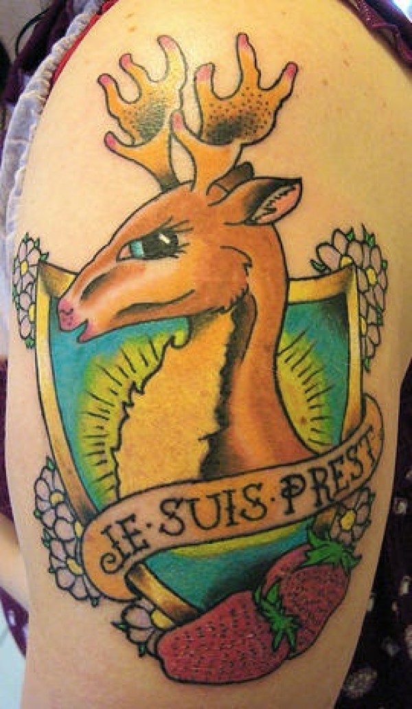 小鹿和草莓字母彩色纹身图案
