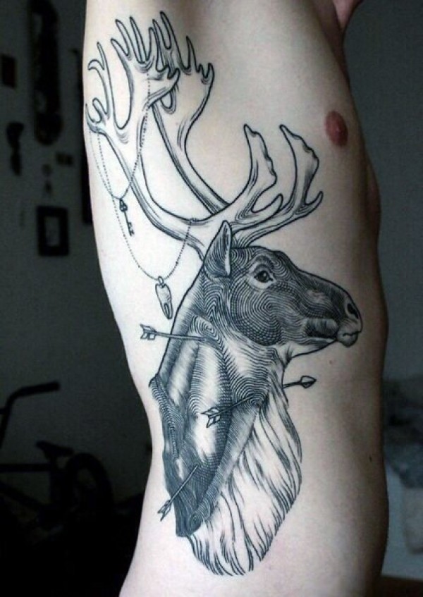 男士侧肋雕刻风格鹿与箭头纹身图案