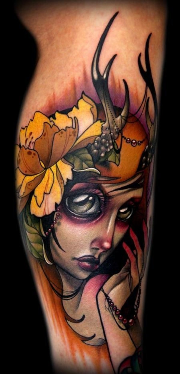 小腿不寻常的彩绘神秘半人半鹿纹身图案