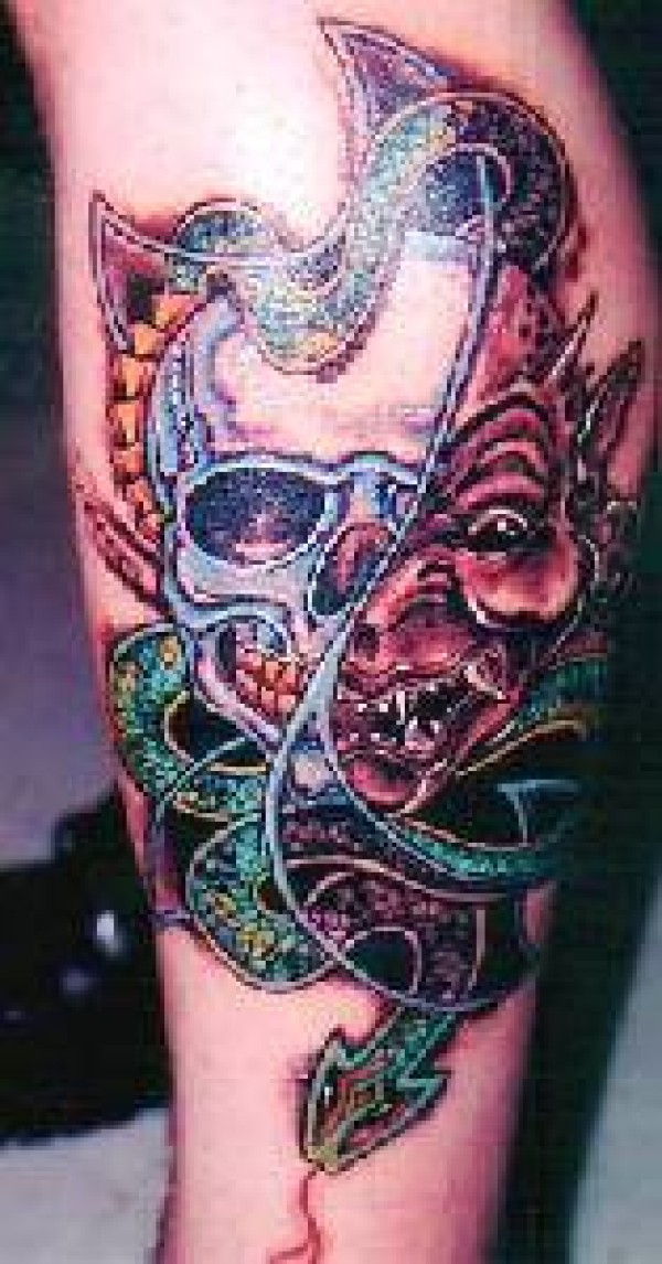 恶魔骷髅蛇彩色纹身图案