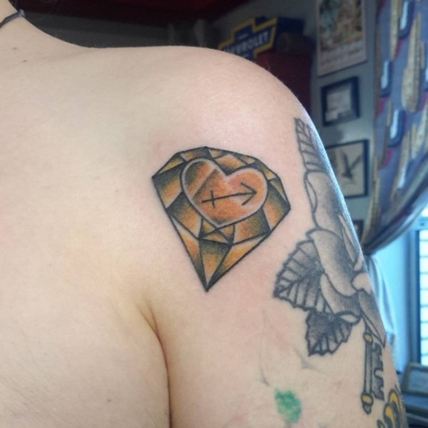 肩部old school黄色钻石与心脏和射手星座纹身图案