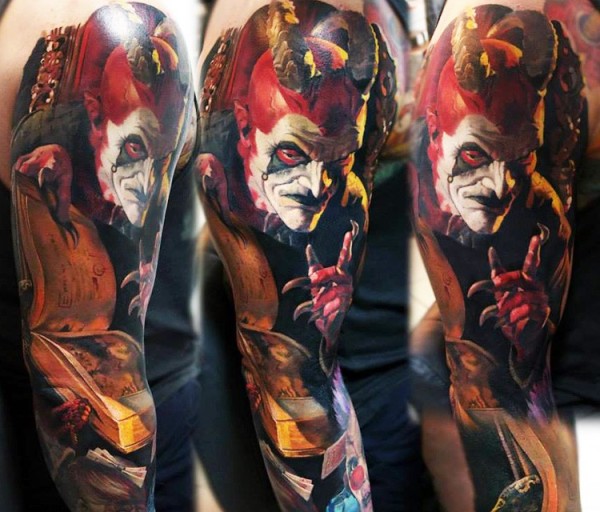 手臂彩色恐怖风格恶魔与法术书纹身图案