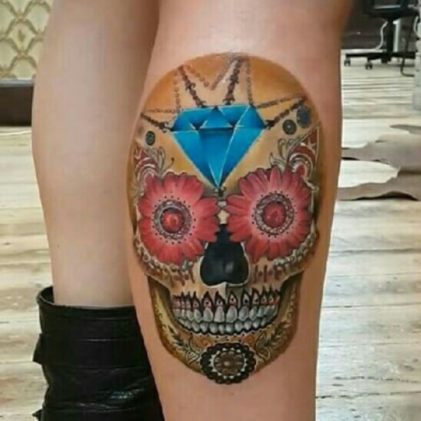 彩色墨西哥风格骷髅与钻石和鲜花纹身图案