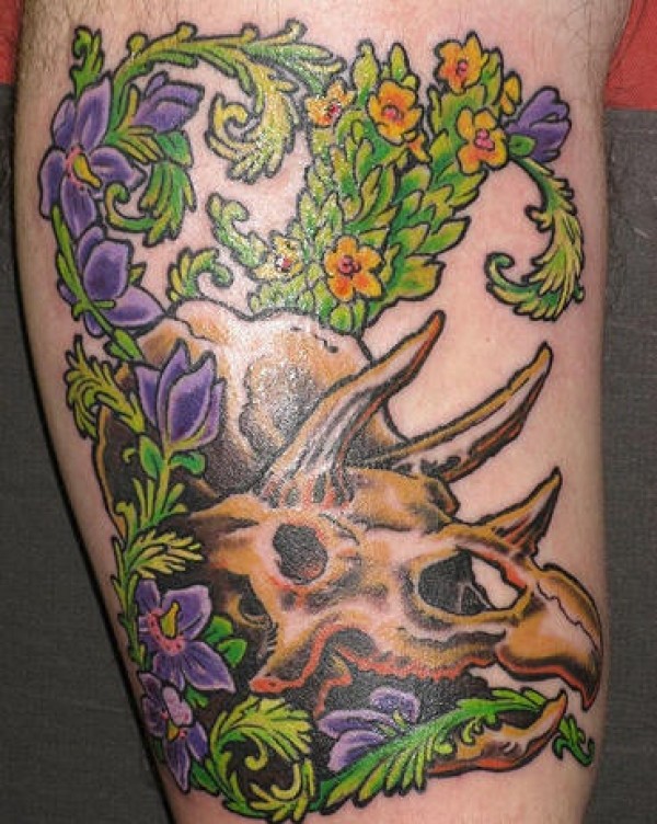恐龙头骨和植物花朵纹身图案