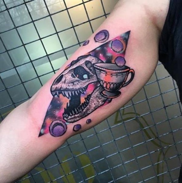 大臂内侧new school恐龙头骨和小行星纹身图案