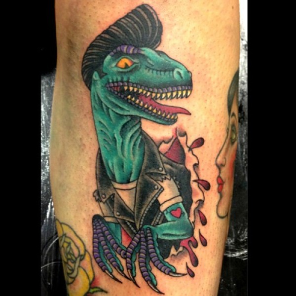 old school彩色埃尔维斯像恐龙纹身图案