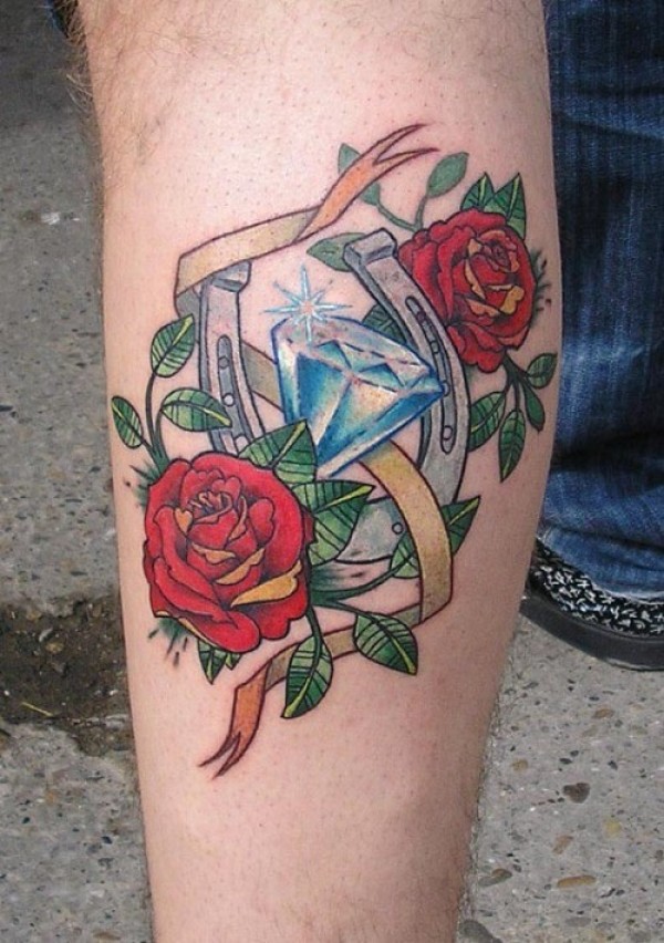手臂钻石和红色玫瑰马蹄铁纹身图案