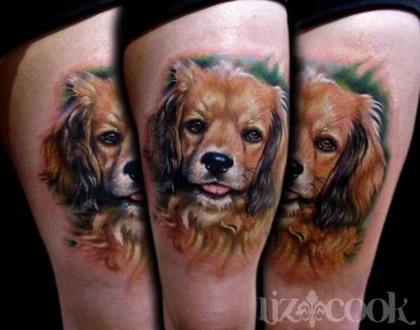 大腿写实风格彩色滑稽狗肖像纹身图案