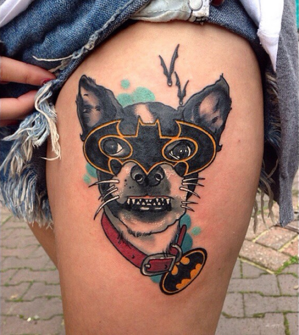 大腿插画风格彩色搞笑狗与蝙蝠侠面具纹身图案