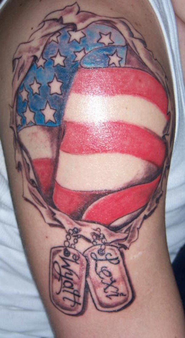 大臂美国国旗和狗标签皮肤撕裂纹身图案