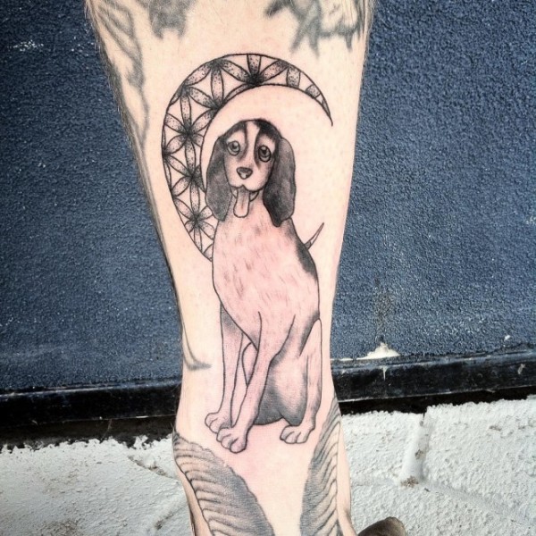 小腿滑稽的狗和月亮纹身图案